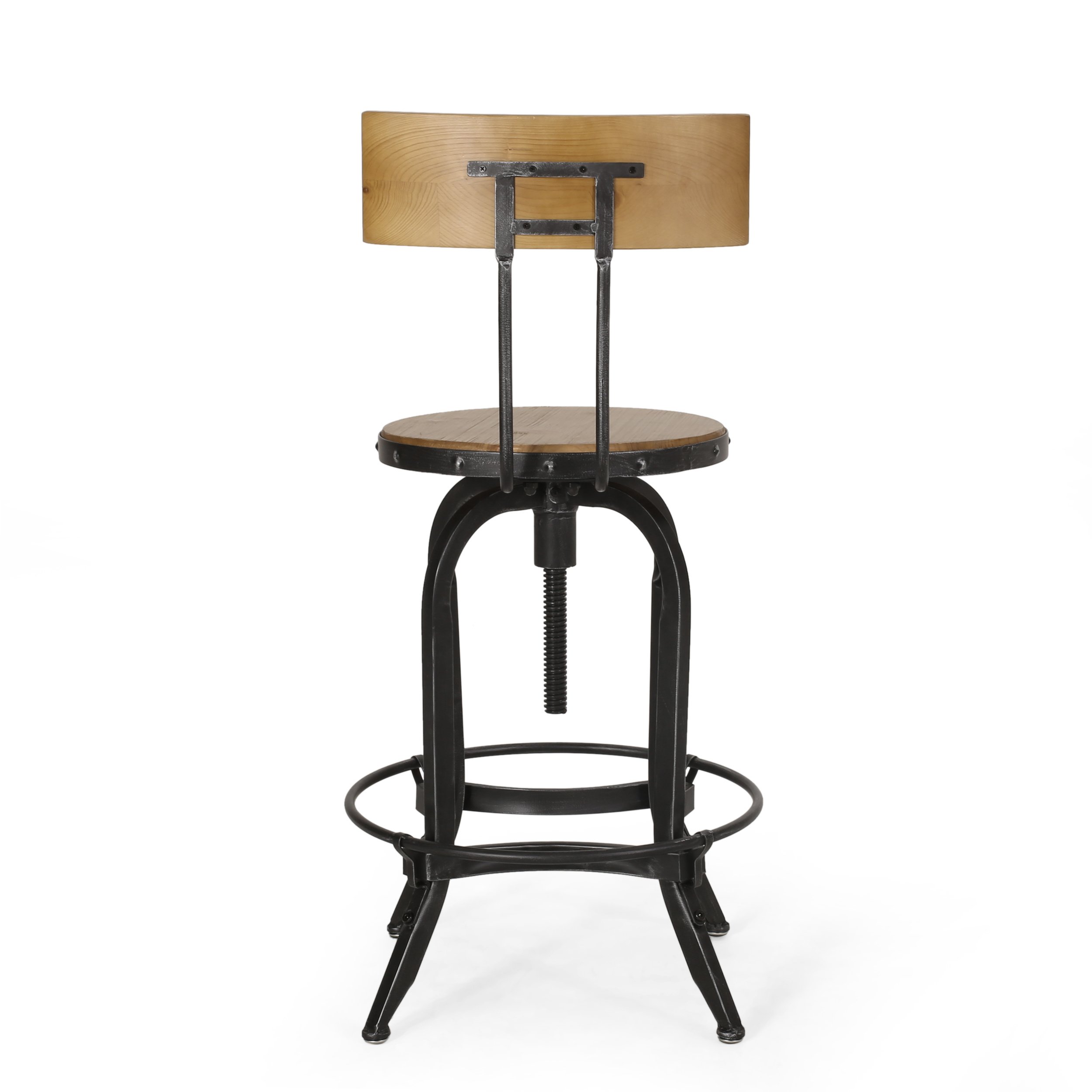 Style your home with edgy charm that perfectly suits any home bar or kitchen nook. This barstool offers an exceptional industrial modern appeal for any space with its wrought-iron frame and distressed firwood seating and backrest. Ideal for those who have a variety of guests, this seat offers adjustable and swivel functions for easy maneuverability and personalization, making this a perfect fit for all.