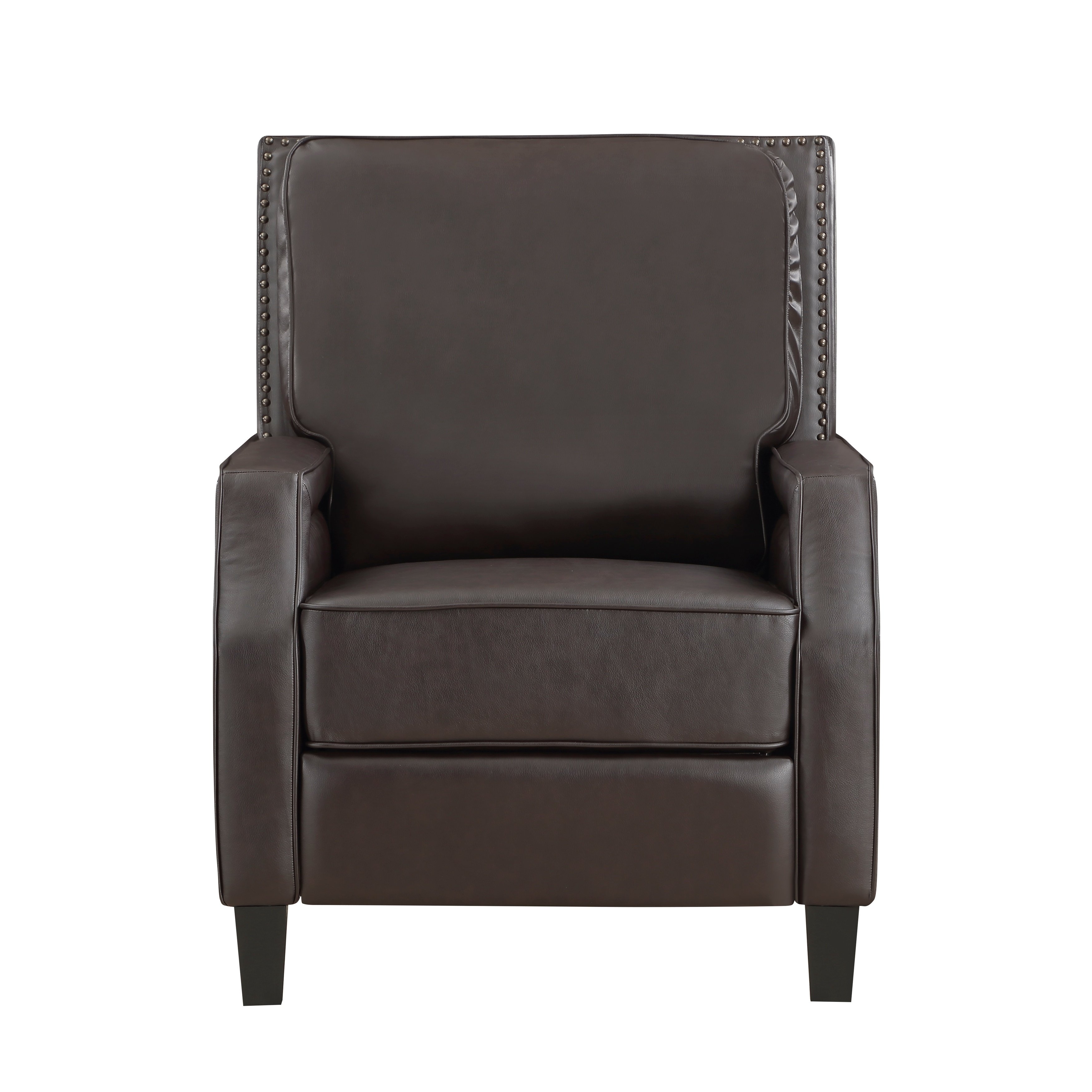 With a reclining mechanism that is engaged with your push, settling into the Berenson Collection is done so with ease. The tailored profile of the push back reclining chair is covered in dark brown faux leather and features nail head trim, lending to its transitional style, creating the perfect complement to your homes décor.
