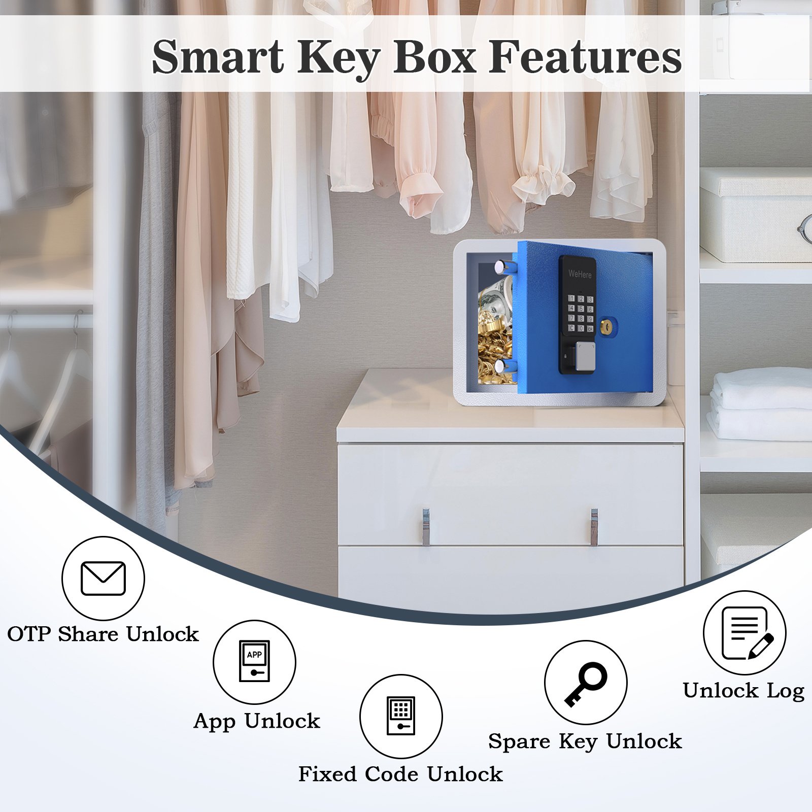[HALF-REMOTE OTP UNLOCK] The box owner shares one-time passcode URL with the user, they doesn't need to install the app to get the passcode, this feature comparable to our Remote Unlock feature. It is easy for the hotel guest.[SIZE & CAPACITY]Our safe has 0.45 cubic feet capacity, it ideal for home, office, hotel storage cash, passports, jewelry, gold, and documents in drawer, cabinet, and wardrobes. External size is 0.72x0.72x0.91 Ft, the internal size is 0.65x0.72x0.9 Ft