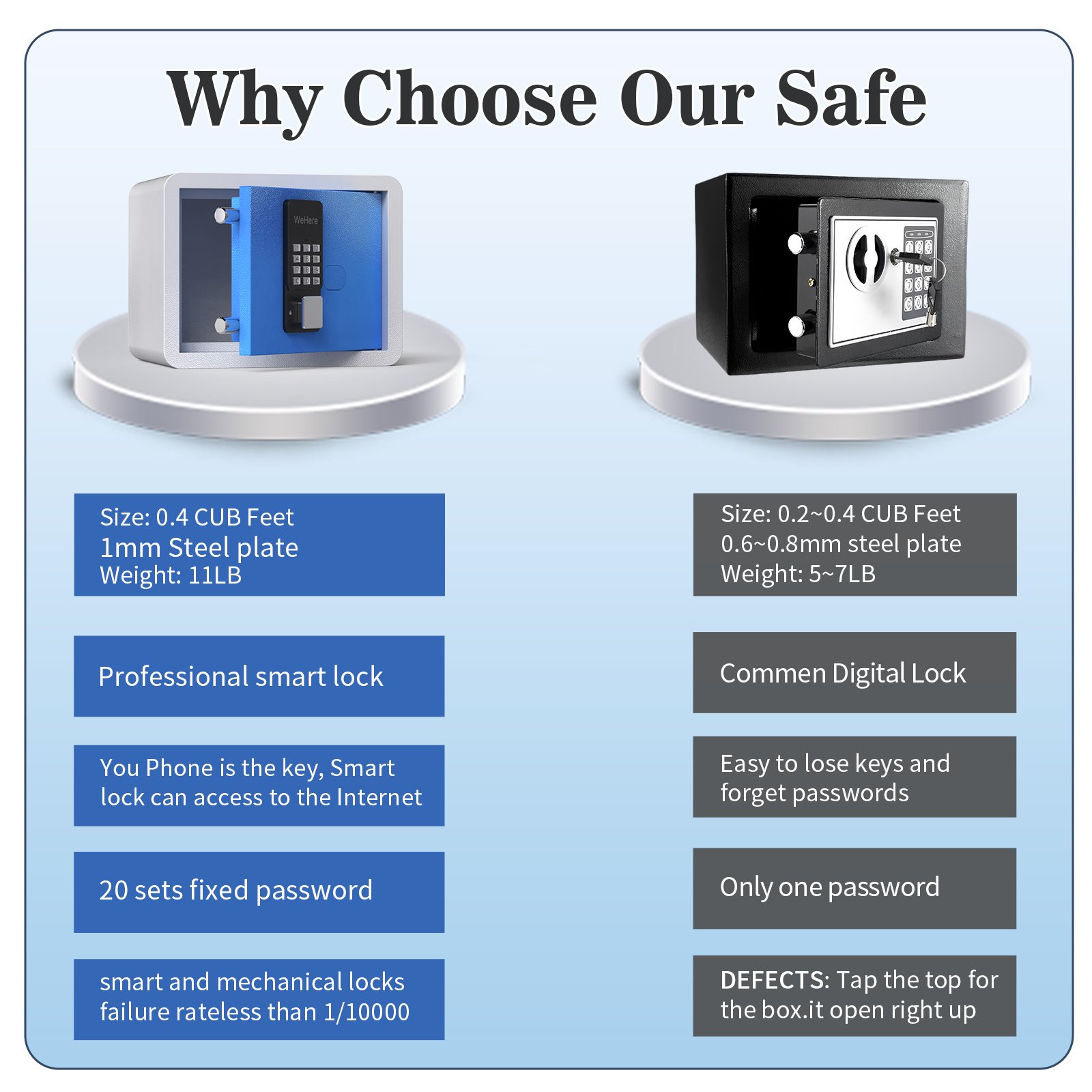 Fire Resistance Feature: The Fire Resistance Security Chest is engineered to withstand high temperatures, offering an extra layer of security for your documents and electronic devices.[SAFE & RELIABLE]Our safes are made from 1mm thick steel weighing 11lbs and feature hidden hinges and seamless edges to make them more difficult to open violently.